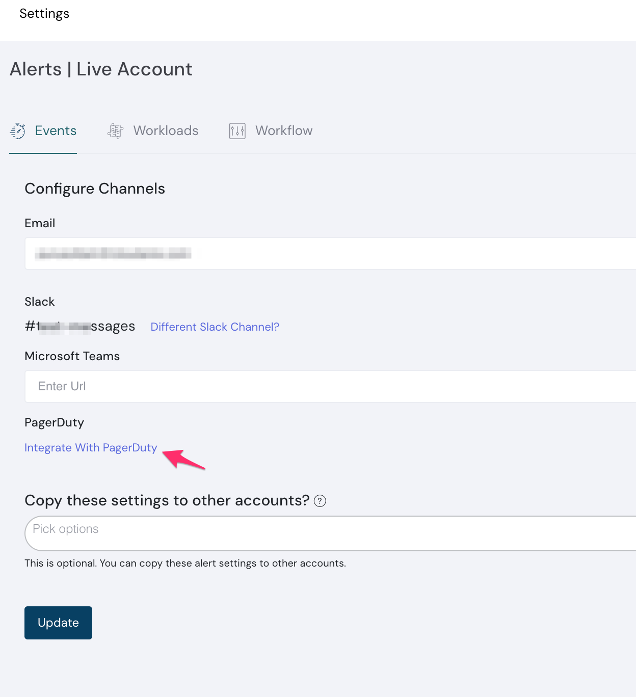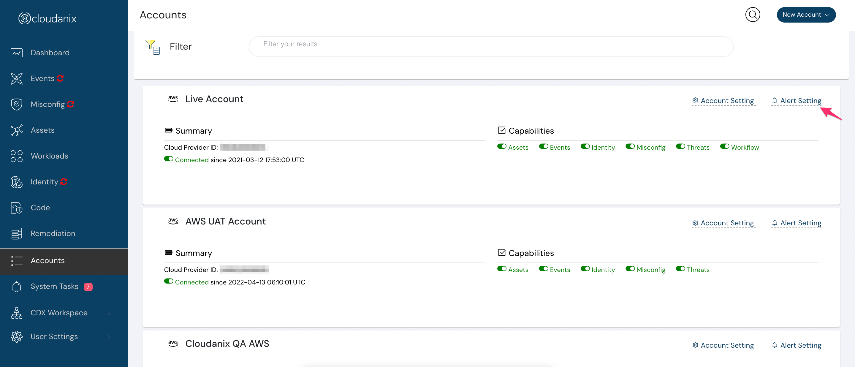 Accounts. This will show you all the Cloud accounts connected with Cloudanix. Select theAlert Settingsfor the account appropriate account which should be connected to PagerDuty.
